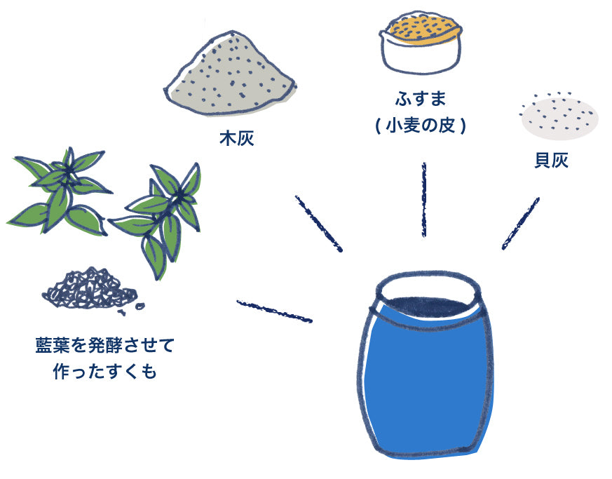 藍の葉を発酵させたすくもに灰汁を加えて自然発酵させる「発酵建て」という方法で藍の色を引き出しています。天然の材料だけを使用していますので、体にやさしく、また使い終わった藍染の液も、土に還り循環することができる、環境に優しい染料です。